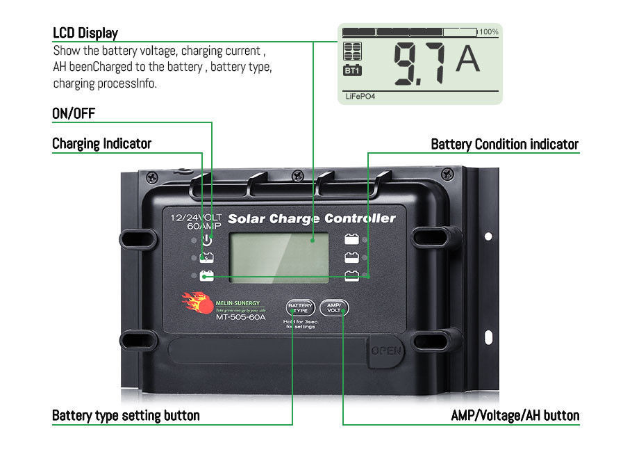 | Max. Entrée d'énergie solaire | Système 1 140 W à 12 V, 2 280 W à 24 V |