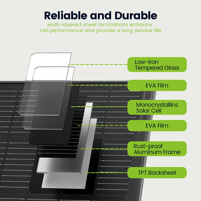 Le panneau solaire tout noir de 130 W fournissant une puissance totale de 130 W sous STC, ce panneau solaire tout noir combine une forte production d'énergie avec une esthétique élégante et unifiée.Son cadre robuste de 35 mm en noir complet assure une durabilité contre les éléments extérieurs et les contraintes mécaniquesConçu pour équilibrer l'apparence époustouflante et une puissance fiable, il est idéal pour les campings, les toits de camping,et toute installation où l'efficacité et l'apparence comptent.