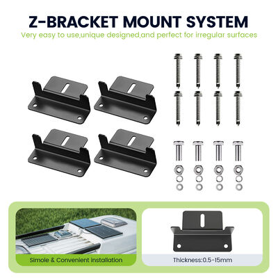 L'installation est simple avec des options de montage fixes incluses dans le kit.Ces solutions de montage sont conçues pour fixer le panneau solaire en toute sécurité au toit de votre VR ou à toute autre surface appropriée, assurant une exposition optimale au soleil et une absorption maximale d'énergie.prévenir tout dommage au panneau solaire causé par le mouvement ou les vibrationsCette caractéristique est particulièrement précieuse pour ceux qui partent fréquemment sur la route et veulent un système solaire durable et durable qui peut résister aux rigueurs du voyage.